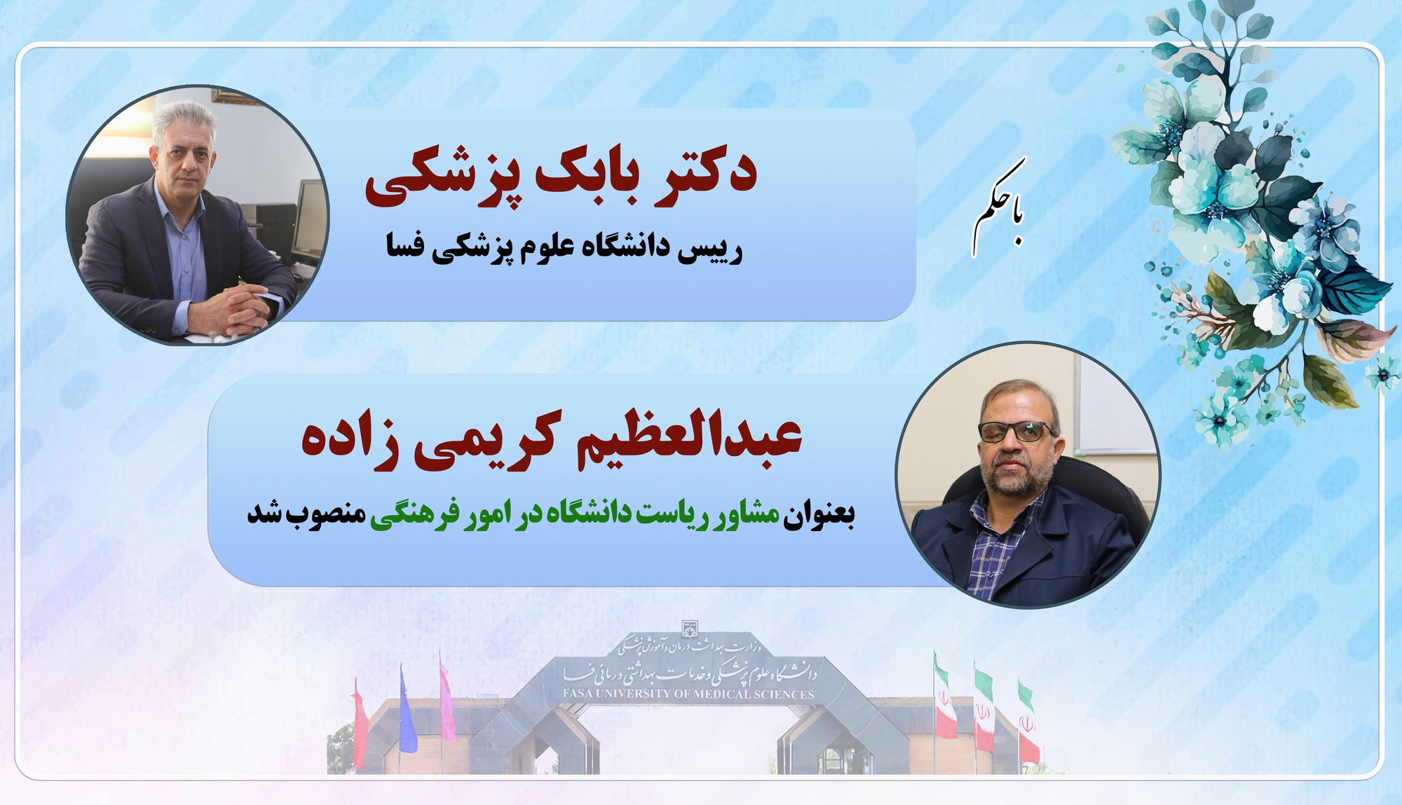 دکتر بابک پزشکی رییس دانشگاه علوم پزشکی فسا در حکمی آقای عبدالعظیم کریمی زاده را به بعنوان مشاور ریاست دانشگاه در امور فرهنگی منصوب کرد.